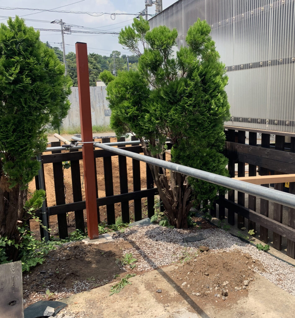 その後の様子です。1本目を立てた次の日に2本目を立てました。2日間くらいこのままにしておきセメントが少し硬化してきたら邪魔なパイプを外します。何回頭ぶつけたかな~。