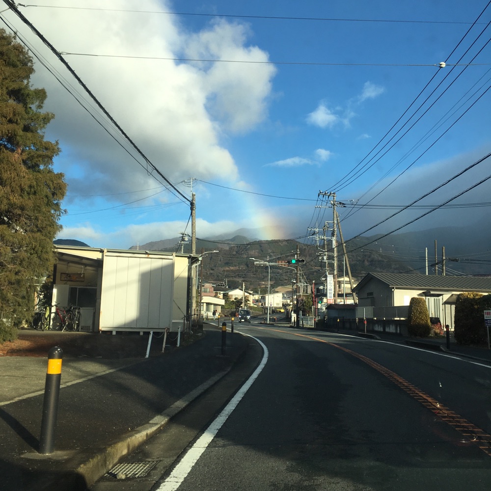 虹の端っこ。って、気になっていたので、追いかけてみたよ。山の上から始まってたニャ(=^x^=)