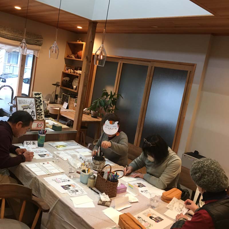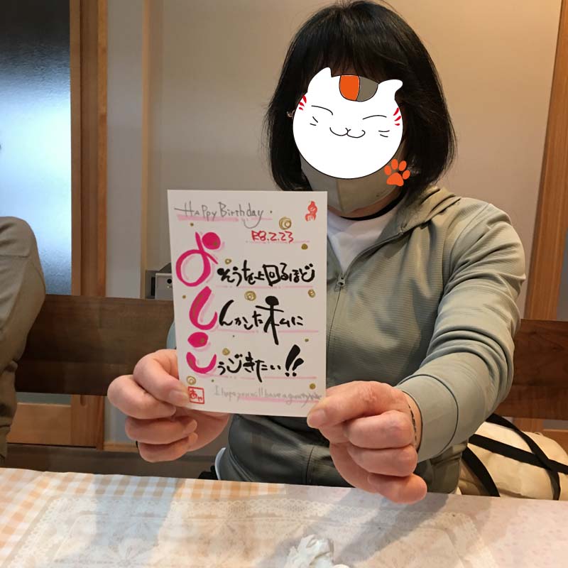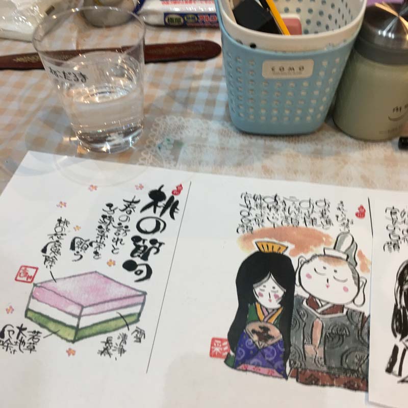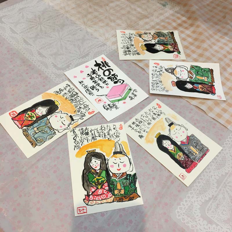 カワイイ⤴⤴⤴テンションめちゃ上がる⤴⤴⤴ 先生のお題を見ながら、お嫁にきたおひな様が、なんか嫌そうに見えるとか。政略結婚ぽいぞ!とか、しょうもないトークで、ワイガヤしながら楽しい時間を過ごしましたよ。最後にみんなの作品をまとめて記念撮影は、いろいろなおひな様が、最高に可愛らしいよね。それと、ヨシコサンのお誕生日月ということで、先生からのハッピーバースデーカードのプレゼント♪カワイイバースデイカードあり♪ バレンタインにちなんだ先生の作品や梅の花作品を鑑賞したり素敵・素敵!