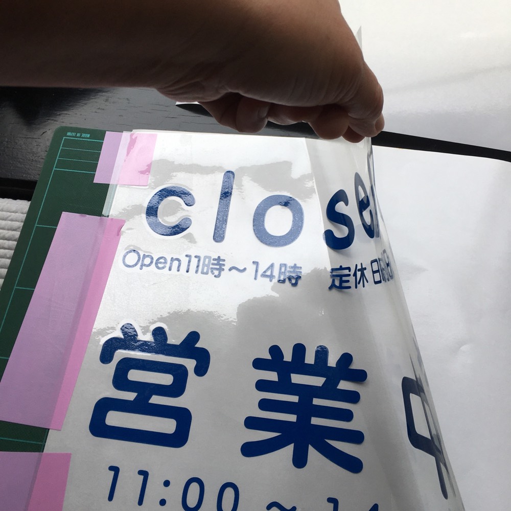 ステカシートを使って、店の看板を新しく作り変え作業。